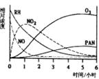 2、选择题 某研究性学习小组,为研究光化学烟雾消长规律,在一烟雾实验箱中,测得烟雾的主要成分为RH(烃)、NO、NO2、O3、PAN(CH3COOONO2),各种物质的相对浓度随时间的消失,记录于右图,根据图中数据,下列推论最不合理的是