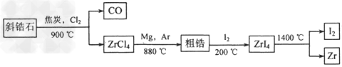 5、填空题 锆(?)主要用于核反应堆燃料棒的包层,这是因为含有1.5%Sn的锆合金具有在辐射下稳定的抗腐蚀性和机械性。以斜锆石(ZrO2)生产金属锆的生产过程示意图如下
