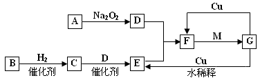 5、填空题 下图表示由短周期元素组成的一些物质之间的转化关系(某些反应产物已略去)。各方框表示有关的一种反应物或生成物(某些物质已经略去),其中A、B、D在常温下均为无色无刺激性气味的气体,C是使湿润的红色石蕊试纸变蓝的气体,M是最常见的无色液体。