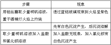 3、实验题 请你设计实验方案验证明明矾中含有K+、Al3+和SO42-,将下表中的实验步骤、实验现象填写完整。