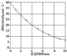 选择题 化合物Bilirubin在一定波长的光照射下发生分解反应,反应物浓度随反应时间变化如下图所示,计算反应4~8? min间的平均反应速率和推测反应16? min时反应物的浓度,结果应是