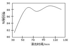 (2)从浸出率和时间图像可以看出,开始随着时间增大,浸出率相应增大,过了60min后浸出率开始下降,随后又上升,但是浸出率与60min时相比变化不大,所以工业采取的浸出时间最好是60min,这样既能使浸出率较高,又能节约成本。