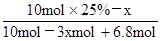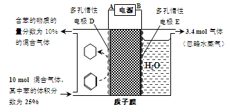 ②电解池中阳极上氢氧根离子放电生成氧气,根据装置图可知阳极上生成3.4mol氧气转移电子的物质的量=3.4mol×4=13.6mol;根据水的组成可知生成1mol氧气时生成2mol氢气,则生成3.4mol氧气时同时生成6.8mol氢气。设参加反应的苯的物质的量是xmol,则参加反应的氢气的物质的量是3xmol,剩余苯的物质的量为10mol×25%-xmol,而反应后苯的含量=