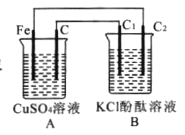 试题分析:(1)对于两个装置来说,左边的是原电池,右边的是电解池。其中对于左边的电池来说,Fe的活动性大于C,所以Fe是负极,C是正极;铁电极电极反应式为Fe-2e-=Fe2+;(2)与电源的负极连接的电极C2是阴极,与电源的正极C连接的电极C1是阳极;在阴极由于溶液中的阳离子H+放电能力大于K+,所以电极反应是2H++2e-=H2↑,破坏了水的电离平衡,水继续电离,最终溶液中的c(OH- )>c(H+),因此石墨棒C2附近的实验现象为产生无色气体,电极附近溶液由无色变为红色;(3)当C2极产生2.24 L气体(标准状态)时,n(H2)= 2.24 L÷22.4L/mol=0.1mol,则n(e-)=0.2mol,由于在整个闭合回路中电子转移的物质的量相等,所以在A中发生反应:CuSO4+Fe= FeSO4+Cu的物质的量是0.1mol,溶解0.1mol的Fe,在电极C上析出0.1mol的Cu,所以CuSO4溶液的质量减轻了(64-56)×0.1=0.8g.