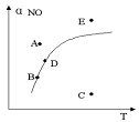 2NO2(g),△H>0,达平衡时NO的转化率与温度的关系,图上标有A、B、C、D、E点,其中表示未达平衡状态且V正<V逆的点是( )
