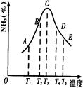 (1)A,B,C,D,E五点中,尚未达到化学平衡状态的点是 。 (2) 向一恒容容器中加入1 mol N2 和3 mol H2,T3时,测得体系压强为原来的7/8,并放出23.1 kJ的热量,则该反应的热化学方程式为 。 (3)当上述反应处于平衡状态时,在体积不变的条件下,下列措施中有利于提高NH3产率的有 (填字母) A.升高温度 B.降低温度 C.增大压强 D.减小压强