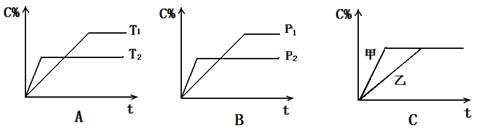 cC(g) + dD(g) ,反应时间与C%(产物C的体积分数)函数关系如图所示。A图表示的是温度不同的曲线,B图表示压强不同的曲线,C图表示使用催化剂和不使用催化剂时的反应曲线。