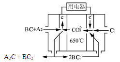 ⑷熔融碳酸盐燃料电池(MCFC)是一种高温燃料电池,被称为第二代燃料电池,是未来民用发电的理想选择方案之一,其工作原理如图所示。现以A2(g)、BC(g)为燃料,以一定比例Li2CO3和Na2CO3低熔混合物为电解质。写出该碳酸盐燃料电池(MCFC)正极的电极反应式____________________________。