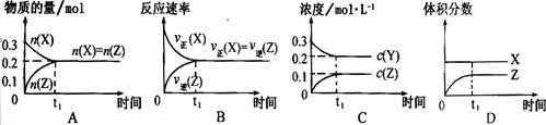 试题分析:A.由于在该可逆反应中,X、Y、Z的物质的量的比是1:3:2,所以每反应消耗1mol的X,就会产生2mol的Z,经过一段时间后达到平衡,但是X:Z改变的物质的量的量的比为1:2,而图1中 则为1:1,因此选项A错误;B .因为反应是从正反应方向开始的,所以V正逐渐减小,V逆逐渐增大,经过一段时间后反应达到平衡,此时用同一物质表示的正反应和逆反应的化学反应速率相同,而用不同物质表示正逆反应速率时由于二者的方程式的系数不同,所以V正=V逆时反应没有达到不是平衡状态,错误;因为在方程式中Y、Z的系数是3:2,所以经过相同的时间达到平衡时二者改变的物质的量的浓度比是3:2,但是题图给出的是1:1,不符合题意,错误;
