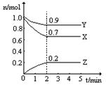 填空题 ( 91EXAM.org2分)某温度时,在2L固定体积的密闭容器中X、Y、Z三种气体随时间的变化如图所示: