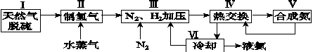 (4)合成氨是放热反应,所以可以预热氮气、氢气,所以合成氨放出的能量得到充分利用的主要步骤是热交换步骤IV;提高合成氨原料总转化率就是使平衡一直正向移动,则可以对原料气加压,平衡正向移动;分离液氨后,平衡正向移动;未反应的N2、H2循环使用,可以增大原料的转化率。