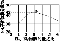 (3)根据图可知,当氢气与氮气的投料比是3时,氨气的平衡体积分数是42%,设开始时氮气的物质的量是1mol,则氢气的物质的量是3mol,平衡时氮气的物质的量减少xmol,生成氨气是2xmol,则2x/(1-x+3-3x+2x) ×100%=42%,解得x=0.59,则平衡时氮气的体积分数是(1-x)/(1-x+3-3x+2x) ×100%=14.5%;