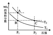 N2O4(g),△H=" -57" kJ·mol-1,在条件下温度为T1、T2时,平衡体系中NO2的体积分数随压强变化曲线如图所示。