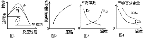 A.图1表示该反应分别在有、无催化剂的情况下反应过程中的能量变化 B.图2表示一定条件下反应达到平衡后改变压强反应物的转化率的变化 C.图3表示一定条件下反应达到平衡后改变温度反应平衡常数的变化 D.图4 表示一定条件下反应达到平衡后改变温度、压强产物百分含量的变化