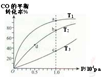 试题分析:A、正方应为放热反应,温度越低,CO的转化率越大。根据图像可知T1<T2<T3,A错误;B、根据图像可知图可知,a、c两点压强相同,平衡时a点CO转化率更高。正方应为放热反应,温度越高转化率越小,则温度T1<T3。降低温度平衡向正反应方向移动,因此K(a)>K(c);平衡常数只与温度有关,b、d两点温度相同,平衡常数相同,即K(b)=K(d),B正确;C、根据图像可知图可知,a、c两点压强相同,平衡时a点CO转化率更高。正方应为放热反应,温度越低,CO的转化率越大,故温度T1<T3。温度越高,反应速率越快,则υ(a)<υ(c);b、d两点温度相同,压强越大,反应速率越大,b点大于d点压强,则v(b)>v(d),C错误;D、正方应体积减小,CO转化率的越大,则混合气体的物质的量越小。根据M=m÷n可知,a点气体的物质的量最小,则M(a)>M(c),M(b)>M(d),D错误,答案选B。