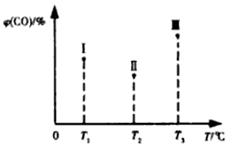 CH3OH(g) △H<0。在容积均为VL的I、Ⅱ、Ⅲ三个相同密闭容器中分别充入amol CO和2a mol H2,三个容器的反应温度分别为T1、T2、T3且恒定不变,在其他条件相同的情况下,实验测得反应均进行到t min时CO的体积分数如图所示,此时I、Ⅱ、Ⅲ三个容器中一定达到化学平衡状态的是 ;若三个容器内的反应都达到化学平衡时,CO转化率最大的反应温度是 。