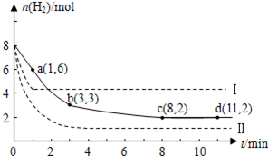 某科学实验小组将6 mol CO2和8 mol H2充入一容积为2 L的密闭容器中(温度保持不变),测得H2的物质的量随时间变化如下图中实线所示(图中字母后的数字表示对应的坐标)。
