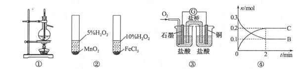 试题分析:A、分离沸点相差较大的互溶液体混合物用蒸馏的方法,温度计水银球应位于蒸馏烧瓶支管口处,错误;B、研究不同催化剂对反应速率的影响应保证H2O2的浓度 相同,错误;C、图③形成原电池,电流计的指针发生偏转,错误;D、对反应: