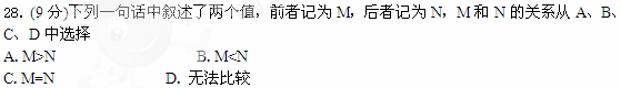 28.(9分)下列一句话中叙述了两个值,前者记为M,后者记为N,M和N的关系从A、B、C、D中选择