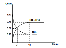 填空题 (15分)研究碳及其化合物有重要意义。 (1)科学家用CO2和H2生产甲醇做燃料。 已知:甲醇的燃烧热ΔH= -726.5kJ/mol;氢气的燃烧热ΔH= -285.8kJ/mol; 则常温常压下,CO2(g)和H2(g)反应生成CH3OH(l)的热化学方程式 。 (2)460℃时,在4L密闭容器中充入1mol CO2和3.25mol H2,在一定条件下反应,测得CO2和CH3OH(g)的物质的量随时间的变化关系如图所示。