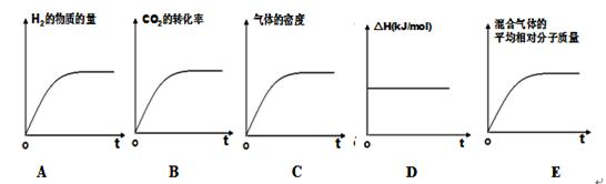 ③A、氢气的起始物质的量不是0,与题意不符,错误;B、二氧化碳的转化率逐渐增大,达到平衡时,不再增大,正确;C、因为是恒容条件,气体的密度始终不变,不能判断为平衡状态,错误;D、一 个化学反应的反应热只与反应物与生成物的状态有关,所以反应热始终不变,错误;E、该反应是气体的物质的量发生变化的可逆反应,所以气体的平均相对分子质量也发生变化,达到平衡时,不再变化,正确,答案选BE;