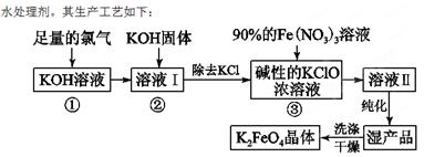 (2)A、根据生产工艺流程图,第①步氯气过量,加入KOH固体后会继续反应生成KClO,正确;B、因温度较高时KOH 与Cl2 反应生成的是KClO3,而不是KClO,错误; C、第③步需要碱性条件,所以碱要过量,正确;D、KClO3转化为 KClO,化合价只降不升,错误。
