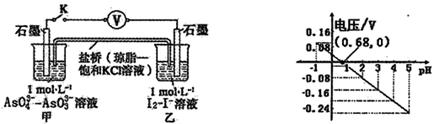 试题分析:A、由右图可知,pH>0.68时,电压小于0,反应逆向进行,pH<0.68时,电压大于0,反应正向进行,所以调节pH可以改变反应的方向,正确;B、pH=0.68时,电压为零,反应处于平衡状态,正确;C、pH=5时,电压小于0,反应逆向进行,AsO33-在负极失电子,则负极电极反应式为As 91exam .orgO33--2e-+H2O=AsO43-+2H+,错误;D、pH>0.68时,电压小于0,反应逆向进行,碘作氧化剂,所以氧化性I2>AsO43-,正确,答案选C。