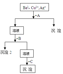 试题解析:(1)溶液含有Ba2+、Cu2+、Ag+,应先加入HCl,生成AgCl沉淀,过滤后在加入Na2SO4,可得到 BaSO4沉淀,最后加入NaOH,可得到Cu(OH)2沉淀,所以沉淀1是氯化银,沉淀2是氢氧化铜,沉淀3是硫酸钡;(2)混合液+A反应的离子方程式为Ag++Cl-=AgCl↓,淀2为Cu(OH)2,溶液+B反应的离子方程式为:Cu2++2OH-=Cu(OH)2↓,故答案为:Ag++Cl-=AgCl↓;Cu2++2OH-=Cu(OH)2↓。