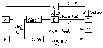试题分析:M和N不溶于稀硝酸,根据转化关系得出M:AgCl,N:BaSO4;C和D是 强酸,C:HCl,D:H2SO4;F是白色沉淀且跟氧气、水生成H,F:Fe(OH)2,H:Fe(OH)3,I是一种金属单质,I是Fe;A和B常温下都是气体,且水溶液都有漂白性,反应生成盐酸和硫酸,A和铁能反应,因此A:Cl2,B:SO2,E:FeCl2,G:FeCl3。(1)SO2+Cl2+2H2O=H2SO4+2HCl;(2)2Fe2++Cl2=2Fe3++2Cl-;(3)2Cl2+2Ca(OH)2=CaCl2+Ca(ClO)2+2H2O;(4)属于氧化还原反应,化合价有变化的,①②⑥。