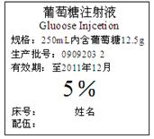 下图是医院病人输液使用的一瓶质量分数为5%的葡萄糖(C6H12O6)注射液标签,请认真观察标签所列内容后填写: