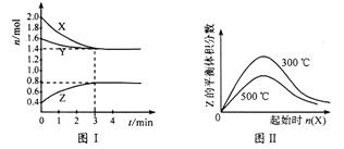 选择题 T °C时,在2 L密闭容器中,X、Y、Z三种气体的物质的量随时间变化如下图I所示。若起始时加入一定量的Y,在不同温度下改变X的量时Z的体积分数变化情况如图II所示。则下列结论正确的是