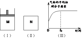 ⑴根据题中数据计算,x =_________、y =_________; ⑵如图Ⅱ,在体积为V L的恒容密闭容器N中发生上述反应(其它条件相同),测得反应过程中气体的平均相对分子质量随时间的变化如图Ⅲ(t0时达平衡),平衡时容器中C的物质的量为z mol。由于反应物A、B的状态未知,则z和y的大小也不确定,请在下表中填入A、B的状态与z、y的大小之间的关系(仿照情形①、可不填满):
