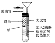 实验题 有人设计出一种在 隔绝空气下让钠与水反应的方法,利用煤油来控制反应速率。使学生能仔细观察到各种实验现象。该方法简便、安全、现象明显、有趣味性,实验装置如下图所示,将半径为6 mm,长为55 mm的玻璃管和长颈漏斗插入橡皮塞孔中。玻璃管外套上30 mm的乳胶管,乳胶管上再接直径为6 mm,长为30 mm的金属尖嘴管,乳胶管上夹上弹簧夹。实验时,往100 mL的大试管中先加入60 mL 蒸馏水,滴加2滴酚酞指示剂振荡均匀后,再加入40 mL煤油,取3粒米粒大小的金属钠放入大试管后塞上橡皮塞,通过漏斗加满滴有酚酞的水。根据反应中观察到的现象,回答下列问题。