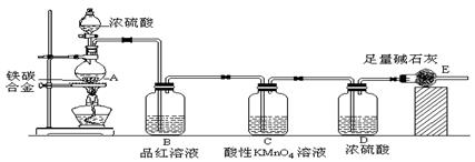 ⑴ m克铁碳合金中加入过量浓硫酸,未点燃酒精灯前,A、B均无明显现象,其原因是 ①常温下碳与浓硫酸不反应;②?? ___________________??。 ⑵写出加热时A中碳与浓硫酸发生反应的化学方程式? ______________________??。 ⑶B中的现象是:?? _______________________________________??; C的作用是:? ___________________ _______________________??。 ⑷待A中不再逸出气体时,停止加热,拆下E并称重,E增重bg。则铁碳合金中铁的质量分数为?? _____________???(写表达式)。 (5)反应一段时间后,用滴管吸取A中的溶液滴入到适量水中作为试样,试样中所含金属离子的成分有以下三 种可能: Ⅰ:只含有Fe3+;Ⅱ:只含有Fe2+;Ⅲ:???????????????????????????????????。