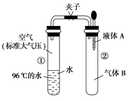1、选择题 如图所示,夹子开始处于关闭状态,将液体A滴入试管②与气体B充分反应,打开夹子,可发现试管①内的水立刻沸腾了。则液体A和气体B的组合不可能是下列的