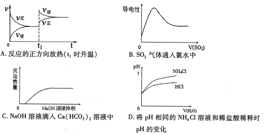 试题分析:A、正反应放热,升高温度正逆反应速率均增大,但逆反应速率增大的程度大于正反应速率增大的程度,平衡向逆反应方向移动,A正确;B、SO2气体通入氯水中发生反应:SO2+Cl2+2H2O=H2SO4+2HCl,溶液的导电性始终增强,B错误;C、氢氧化钠滴入碳酸氢钙溶液中立即产生碳酸钙沉淀,C错误;D、稀释氯化铵溶液促进铵根水解,盐酸是强酸,因此盐酸溶液的pH变化大,D错误,答案选A。