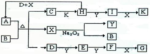 3、填空题 (12分)如下图所示的转化关系中,已知A是由短周期元素组成的酸式盐。通常状况下,D、E、F、Y、H为气体。G和K均为常见的强酸,D和X的分子中均含有10个电子。请回答下列问题: