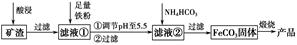 (1)“酸浸”过程中Fe3O4发生反应的离子方程式为______________________________。为提高“酸浸”中铁元素的浸出率,除了采用合适的液固比和循环浸取外,适宜的条件还有____________________、____________________。(任举两例) (2)调节pH至5.5的目的是______________________________________。 (3)滤液②中加入NH4HCO3时需要控制反应温度不能过高,原因是__________________________________________________。(答一点即可) (4)在空气中煅烧FeCO3制备高纯氧化铁的化学方程式为_______________________________________________________。