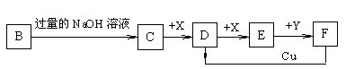 5、填空题 (14分)已知B是一种由三种短周期(各位于不同周期)元素组成的正盐,该盐在常用锌锰干电池中做电解质;Y在常温下为液态,E的相对分子质量比D大16,它们存在如下转化关系(反应条件及部分产物已略去):