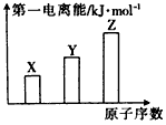 1、填空题 元素周期表中第三周期相邻的三种主族元素X、Y、Z的第一电离能的大小与原子序数的关系如图所示。