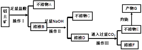 试题分析:加入盐酸后,铝土矿中的Al2O3、Fe2O3、MgO能和盐酸反应,而SiO2不能溶解,即不溶物A是SiO2,操作Ⅰ是过滤;所得的滤液B有氯化铝、氯化铁、氯化镁以及过量的盐酸,向其中加过量的烧碱,所得不溶物C为Mg(OH)2? Fe(OH)3,操作Ⅱ也是过滤, 所得滤液D的主要成分为偏铝酸钠,通入过量CO2的化学方程式为NaA1O2+CO2+H2O=Al(OH)3 ↓+NaHCO3,操作Ⅲ也是过滤,将它们分离,不溶物E为Al(OH)3,灼烧后生成产物G为Al2O3,(1)操作Ⅰ、Ⅱ、Ⅲ的名