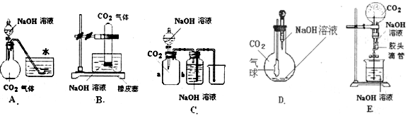4、实验题 (10分) CO2和NaOH的反应是一个很基本的化学反应,有很多的实验方法可以通过观察到的明显现象说明CO2与NaOH溶液发生了反应.现提供如下实验用品:集气瓶、烧瓶、分液漏斗、长颈漏斗、导管、橡皮管、弹簧夹、烧杯、量筒、水、CO2气体、NaOH溶液以及你认为所能用到的仪器和药品.现有五位同学设计了如图所示的A~E五个装置,试回答: