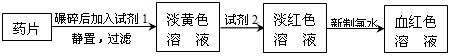 3、实验题 铁是人体必须的微量元素,治疗缺铁性贫血的常见方法是服用补铁药物。“速力菲”(主要成分:琥珀酸亚铁,呈暗黄色)是市场上一种常见的补铁药物。该药品不溶于水但能溶于人体中的胃酸。某同学为了检测“速力菲”药片中Fe2+的存在,设计并进行了如下实验: