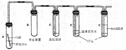 实验选用细铜丝、98.3%H2SO4、品红溶液、澄清石灰水、CC14、NaOH溶液等药品,铜丝被卷成螺旋状,一端没入浓H2SO4中,另一端露置在液面上方。