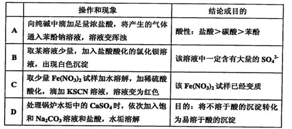 2、选择题 下表中实验“操作和现象”与“结论或目的一均正确的一组是