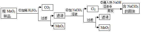 本题解析:(1)样品加稀硫酸后,MnO2不溶,而MnO和MnCO3均溶于其中: MnCO3+H2SO4=MnSO4+H2O+CO2↑???? MnO+H2SO4=MnSO4+H2O 过滤后得到MnSO4滤液 (2)由图示可知,NaClO3中的氯元素化合价降为0价氯气,做氧化剂,氧化了溶液中的MnSO4,氧化产物为MnO2:5Mn2++2ClO3-+4H2O=5MnO2↓+Cl2↑+8H+ (3)蒸发需要的仪器包括:铁架台、蒸发皿、酒精灯、玻璃棒等 (4)由上述方程式可计算出:MnCO3为0.01mol,质量为1.15g,可消耗0.01mol的硫酸,进而可计算出MnO为2.84g,也就是0.04mol,可消耗0.04mol的硫酸;故最少需要硫酸的物质的量为0.05mol
