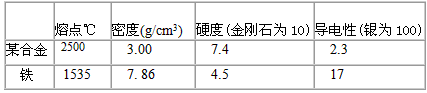 4、选择题 某合金与铁的物理性质的比较如下表,还知该合金耐腐蚀、强度大。从以上性能来看,该合金不适合作