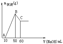 试题分析:(1)根据图像可知,溶解氢氧化铝消耗的氢氧化钠溶液体积是60ml-50ml=10ml,则根据反应的化学方程式Al(OH)3+NaOH=NaAlO2+2H2O可知,氢氧化铝的物质的量是1mol/L×0.01L=0.01mol,因此根据原子守恒可知,铝的质量是0.01mol×27g/mol=0.27g;生成氢氧化铝消耗的氢氧化钠是溶解氢氧化铝消耗的氢氧化钠的3倍,则和铝离子反应的氢氧化钠是30ml,实验和镁离子反应的氢氧化钠是50ml-10ml-30ml=10ml。则根据反应式Mg2++2O