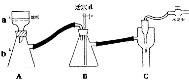 ⑴步骤②的实验操作装置如下图所示,仪器a的名称为????,装置B的作用是????。 则当抽滤完毕或中途停止抽滤时,最佳的正确操作是????????。 ⑵得到的沉淀常用95%的酒精洗涤再抽滤,试问用酒精洗涤的原因???。(3)实验测??????得火柴头中KClO3的质量分数为?????????;未洗涤沉淀,测得KClO3的质量分数将??????????????????????(填???“偏大”、“偏小”、或“无影响”,下同)。