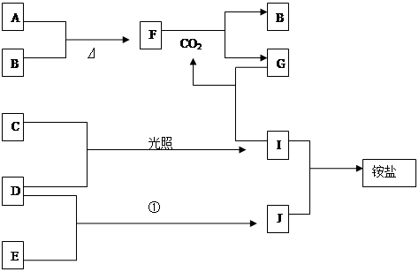 2、填空题 (13分)下图是部分短周期元素的单质及其化合物(或其溶液)的转化关系,已知B、C、D、E是非金属单质,且在常温常压下都是气体,化合物G的焰色反应为黄色,化合物I和J通常状况下呈气态;反应①是化工生产中的一种重要固氮反应。